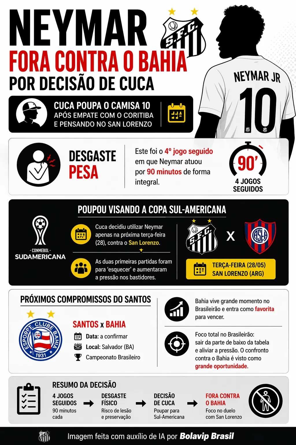 No entanto, o torcedor santista tem outros motivos para se preocupar. Isso porque, segundo exposto por Cuca em coletiva de imprensa após o jogo, Neymar não irá jogar contra o Bahia.
