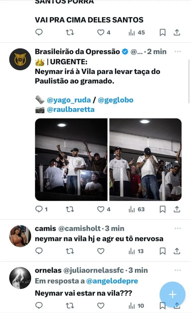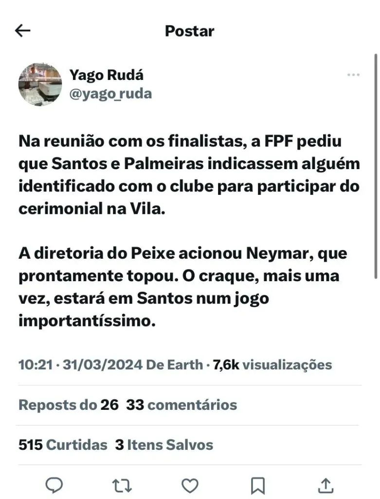 O perfil oficial do Santos criou uma alvoroço neste sábado (30), deixando no ar que um ex-atleta do Clube poderia entrar com a taça do Paulistão. A torcida logo apontou o nome de Neymar. Segundo informado pelo GE, realmente, ele entrará com a taça do torneio no gramado.