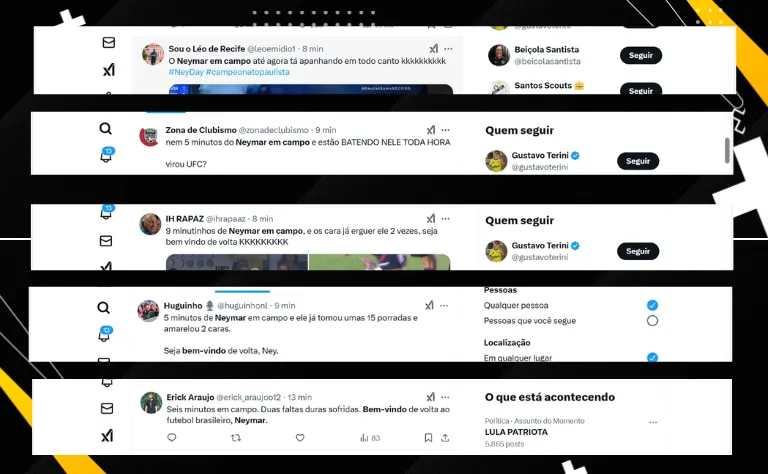 Com seis minutos em campo, Neymar já havia amarelado dois marcadores do Botafogo-SP: Alisson Cassiano e Gabriel Bispo. O craque era ‘caçado’ em campo pelos marcadores e os torcedores reclamaram do árbitro pelo rodízio.