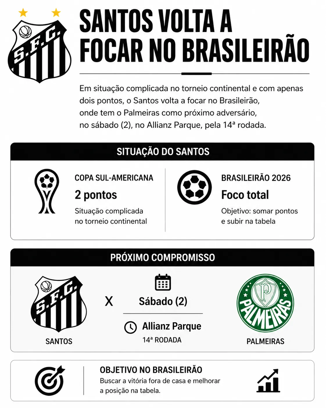 Em situação complicada no torneio continental e com apenas dois pontos, o Santos volta a focar no Brasileirão, onde tem o Palmeiras como próximo adversário, no sábado (2), no Allianz Parque, pela 14ª rodada.