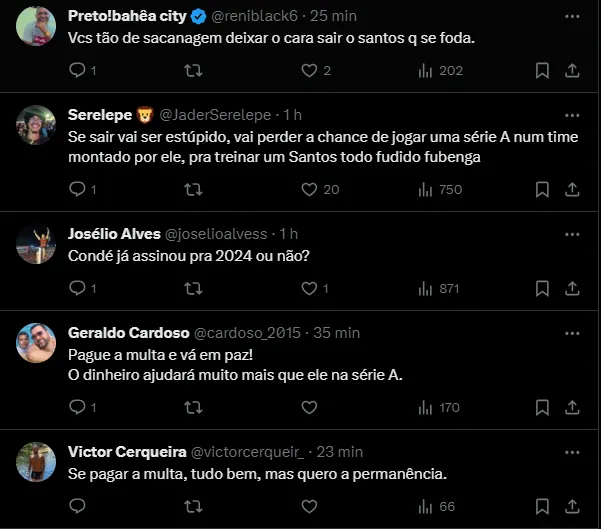 Apesar do grande desafio de comandar o Santos, tirá-lo do clube baiano não deve ser fácil, já que Condé tem contrato com a equipe até dezembro de 2024 e está com prestígio depois do título nacional.