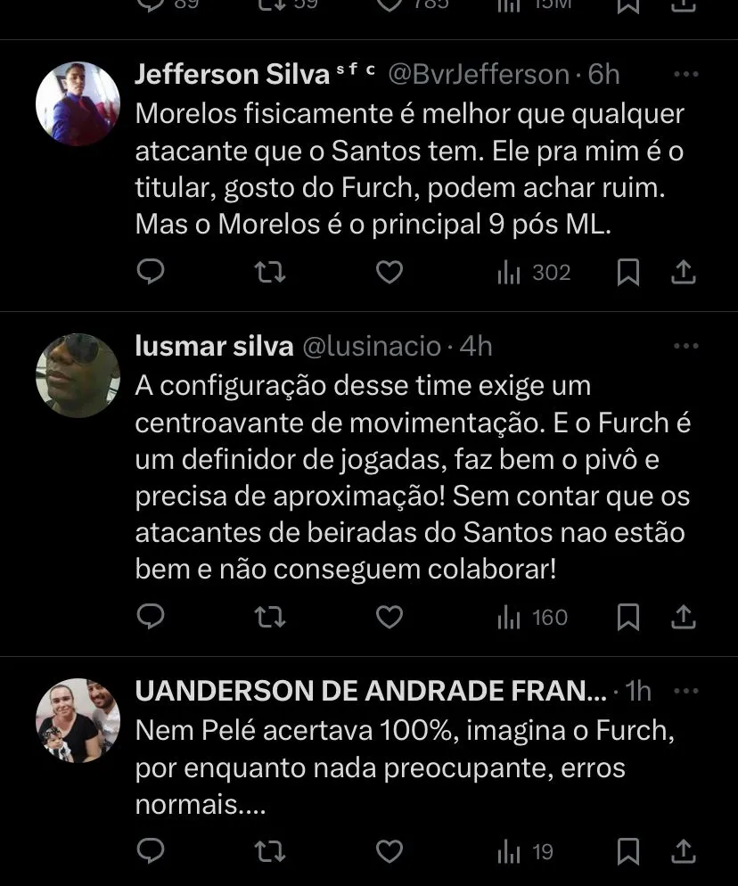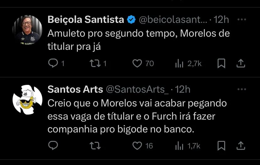 (SIC): “Amuleto para o segundo tempo. Morelos de titular para já”; “Creio que o Morelos vai acabar pegando essa vaga de titular e o Furch irá fazer companhia para o Bigode no banco”, foram alguns comentários.
