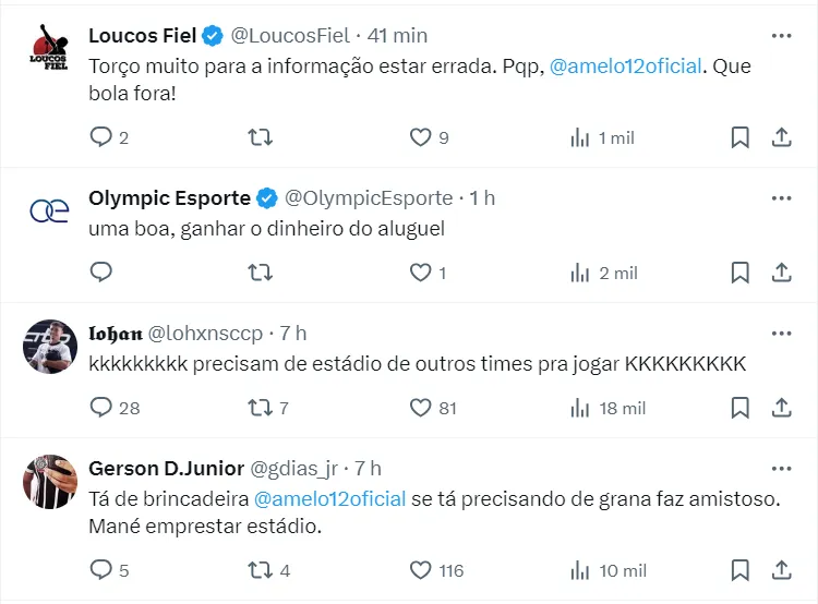 O presidente do Corinthians, Augusto Melo, liberou a utilização do estádio pelo rival. O comunicador ainda destacou que as áreas administrativas e financeiras dos clubes conversaram para conseguir fechar a parceria.