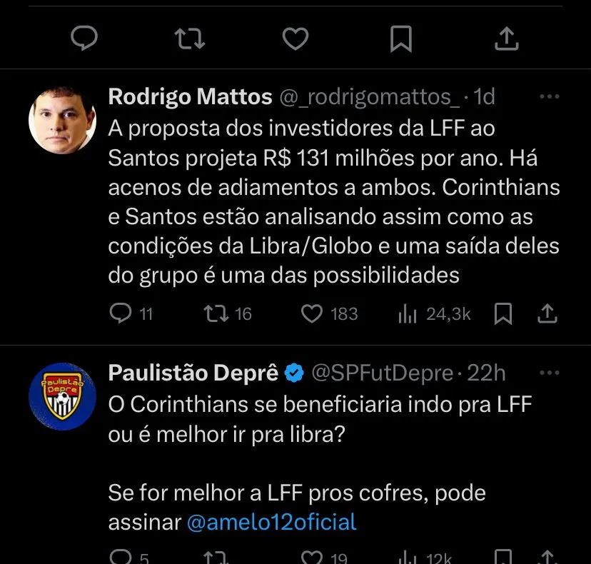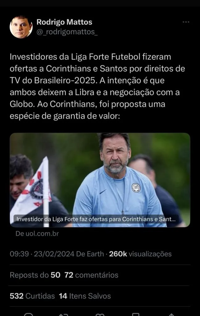 Com essa decisão do rival, o Santos que também recebeu uma proposta da Liga Forte Futebol, foi informado através do UOL Esporte. Até então, é esperado que o Santos saia também ao lado do Corinthians.