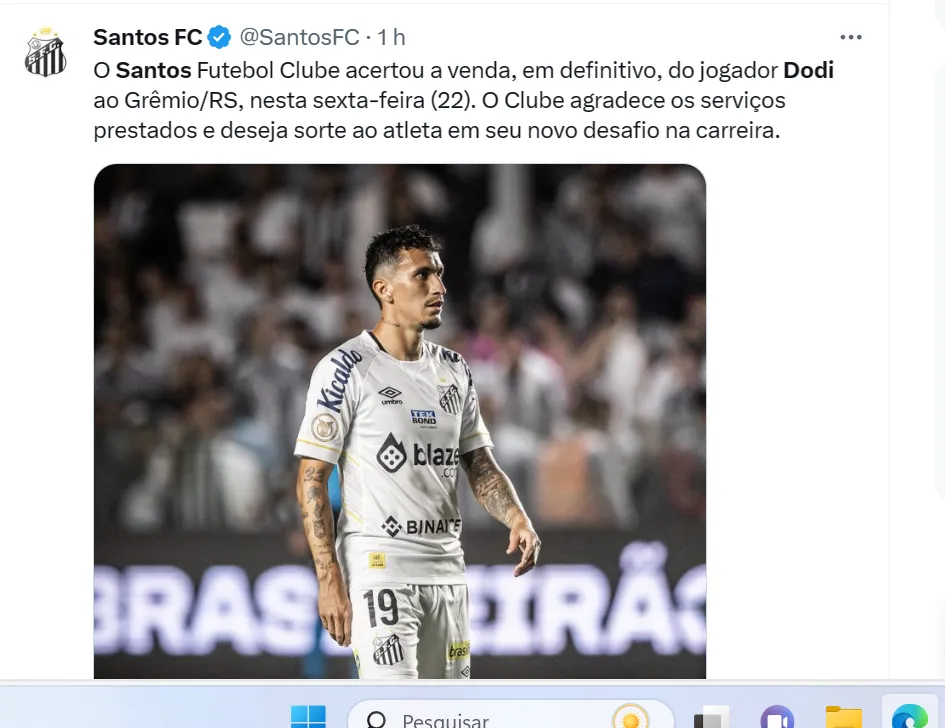 Foram 49 jogos e apenas uma assistência pelo Peixe. O Santos não confirma os valores, mas Dodi assinará contrato com o Grêmio até o fim de 2026. Depois de ser rebaixado para a Série B do Brasileirão, o Santos está readequando sua folha salarial e por isso tem negociado jogadores.