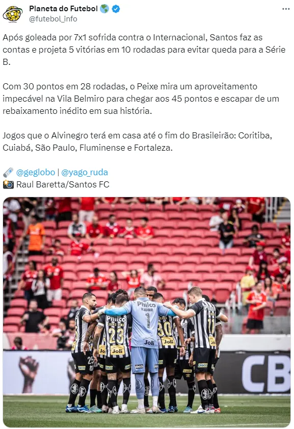 Com um saldo negativo de 21 gols no Campeonato Brasileiro, nada além de vitórias poderão salvar o Santos. Em um cenário em que Bahia, Cruzeiro e Internacional se distanciam do Z-4, o Peixe precisará torcer para que Vasco e Corinthians continuem tropeçando na competição. As chances de rebaixamento já ultrapassam os 50%, mas enquanto houver esperanças, o torcedor alvinegro vai seguir apoiando esse gigante do futebol.