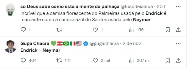 Apesar da idolatria por Neymar e toda rivalidade com o Palmeiras, até mesmo os santistas precisam admitir que o camisa 9 do rival traz um pouco aquilo que Neymar foi ao Santos. A diferença é que o Palmeiras não vai ter o mesmo tempo com o Endrick, já que em 2024 ele desembarcar também na Espanha, só que do lado oposto.