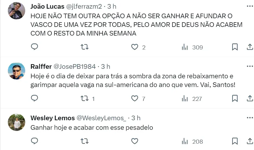 O Santos aparece em 15º lugar do Brasileirão, com 43 pontos, e foi beneficiado pela derrota do Vasco na última terça-feira (28), contra o Corinthians por 4 a 2, em São Januário, pela 36ª rodada.