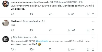 Além disso, Mendoza sabe do desejo do Santos negociá-lo, porém ele não queria retornar ao futebol do seu país e ainda quer jogar na elite do futebol brasileiro. Nas redes sociais, a torcida do Santos opinou sobre a negociação.