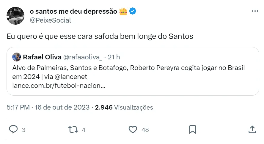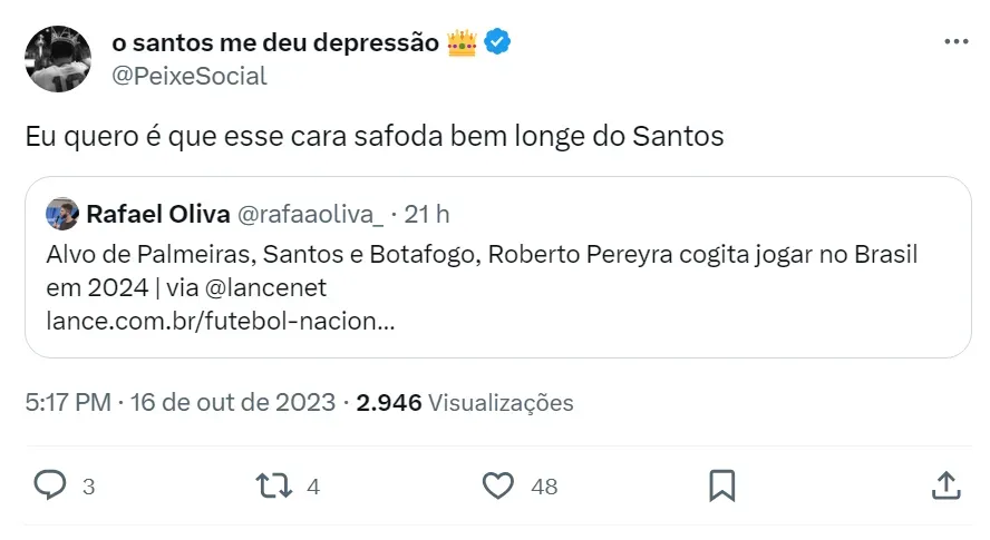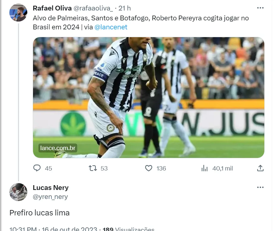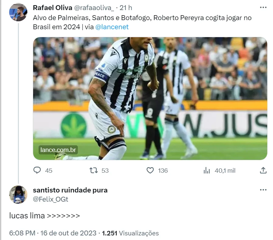 Inclusive, muitos torcedores do Santos no Twitter estão falando que Lucas Lima é melhor que Roberto Pereyra. De volta ao Alvinegro Praiano nesta temporada, o camisa 23 tem um gol e quatro assistências em 24 partidas disputadas no Campeonato Brasileiro. O meia do Peixe cumpriu suspensão contra o Palmeiras e volta ao time titular diante do Red Bull Bragantino, na quinta-feira (19), pela 27ª rodada da competição nacional.