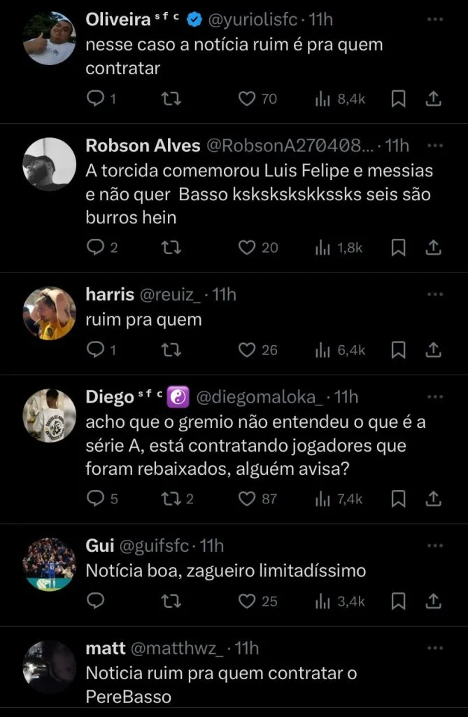 Nas redes sociais, a torcida do Santos falou sobre a saída de mais um atleta do elenco. A maioria aprova a saída de João Basso, porém há quem reprove: (SIC) “Nesse caso a notícia ruim é para quem contratar”, comentou um.