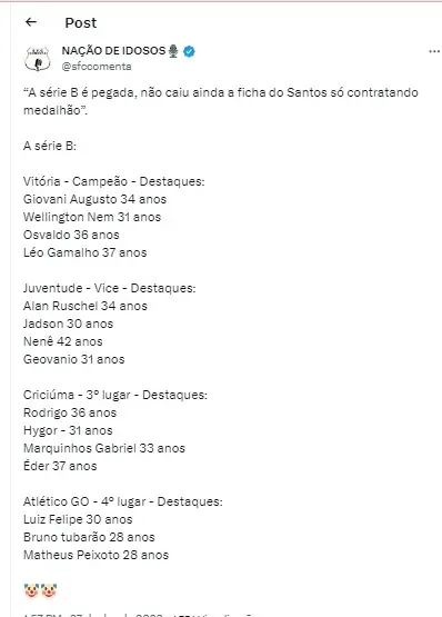 Nas redes sociais, a torcida do Santos falou sobre o time estar repleto de ‘medalhões’: (SIC) “A série B é pegada, não caiu ainda a ficha do Santos só contratando medalhão”. A série B: Vitória – Campeão – Destaques: Giovani Augusto 34 anos; Wellington Nem 31 anos; Osvaldo 36 anos e Léo Gamalho 37 anos”; “A gente só vai entender na prática se um time cheio de medalhões dará certo dentro de campo. Em 2023, o Corinthians não deu, por exemplo, mas o Fluminense sim. Do ponto de vista físico, a exigência do Santos será menor – no máximo, 54 jogos durante a temporada”, foram os comentários dos santistas.