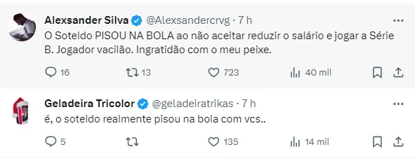 Estes foram alguns dos tantos comentários que a torcida alvinegra fez. Além disso, a torcida relembrou do lance onde Soteldo pisa em cima da bola, na vitória do Peixe em cima do Santos, por 4 a 1, no Campeonato Brasileiro.