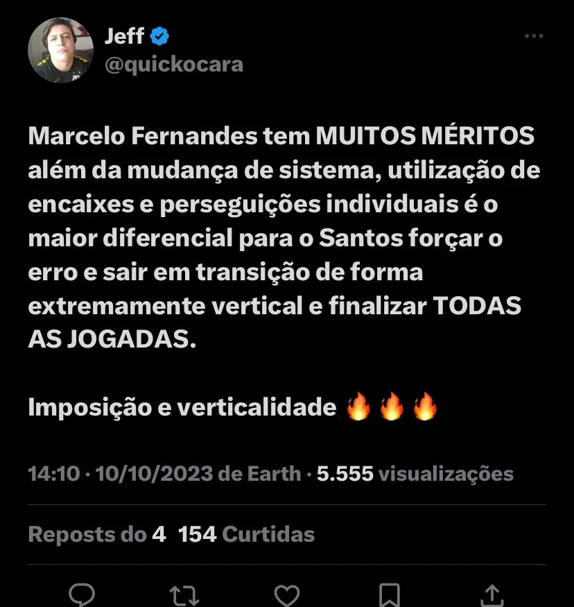 (SIC) “Uma coisa é fato: o Marcelo Fernandes está indo muito bem nas entrevistas também, sempre muito lúcido e com os pés no chão”; Marcelo Fernandes tem MUITOS MÉRITOS além da mudança de sistema, utilização de encaixes e perseguições individuais é o maior diferencial para o Santos forçar o erro e sair em transição de forma extremamente vertical e finalizar TODAS AS JOGADAS”; “Trabalho fantástico! Marcelo Fernandes pegou uma situação caótica e complicadíssima e enfileirou 3 vitórias, 2 viradas fora de casa! Sensacional! Está de parabéns, esse momento é todo dele”, foram os comentários dos torcedores do Peixe.