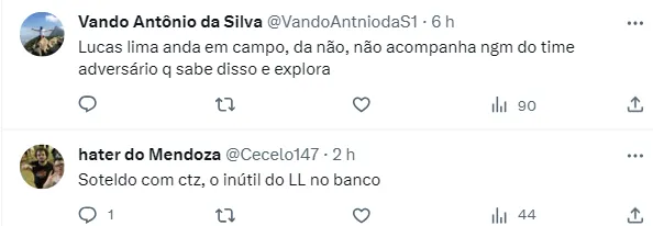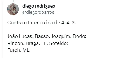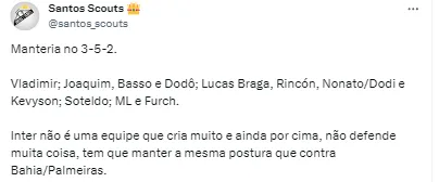 Já pensando nessa partida, a torcida já se manifestou nas redes sociais pensando em uma escalação ideal. O time enfrenta o Internacional fora de casa, no próximo domingo, às 18h30 (horário de Brasília), no Beira-Rio, pela 28ª rodada da competição. Em relação ao ataque, os torcedores têm quase que uma opinião unânime sobre Marcos Leonardo e Furch, no gol Vladimir é o favorito e muitos pedem Lucas Lima no banco.