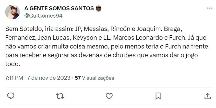 Já no ataque, o colombiano Mendoza foi titular contra o Cuiabá e não foi bem. Com isso, a torcida do Santos acredita que a melhor alternativa é apostar em Julio Furch atuando ao lado de Marcos Leonardo.