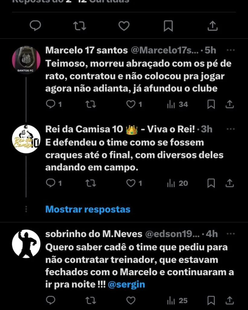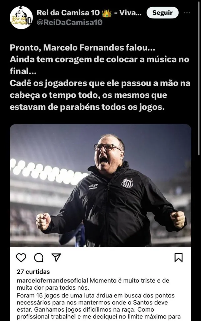 “As últimas horas foram de muita tristeza e dor, mas não tenho dúvidas que o Santos voltará mais forte do que nunca. Santos o time da virada, Santos o time do amor”, finalizou em suas redes sociais.
