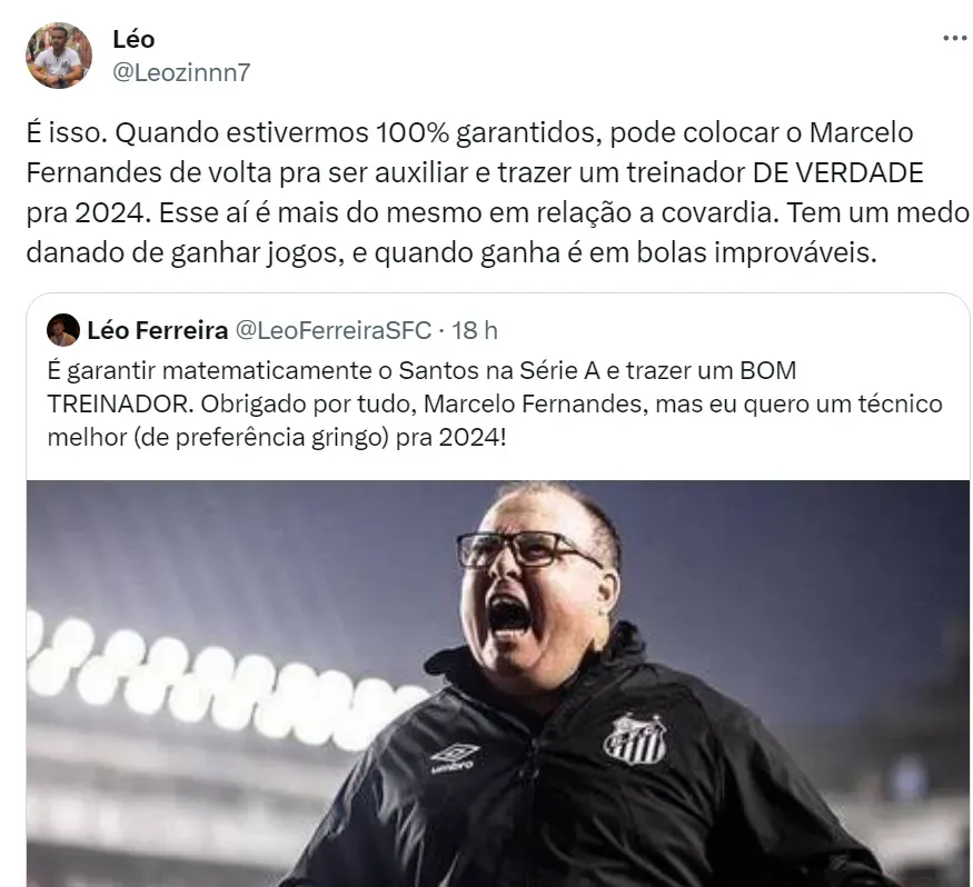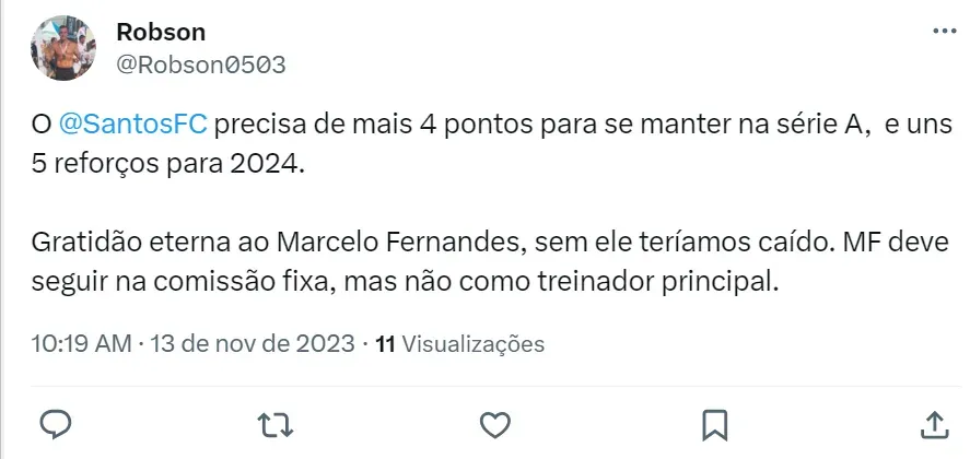 Na web, a torcida do Peixe acredita que Marcelo Fernandes deve voltar ao cargo de auxiliar fixo na próxima temporada. Na opinião dos santistas, o time da Vila Belmiro necessita de um treinador melhor.