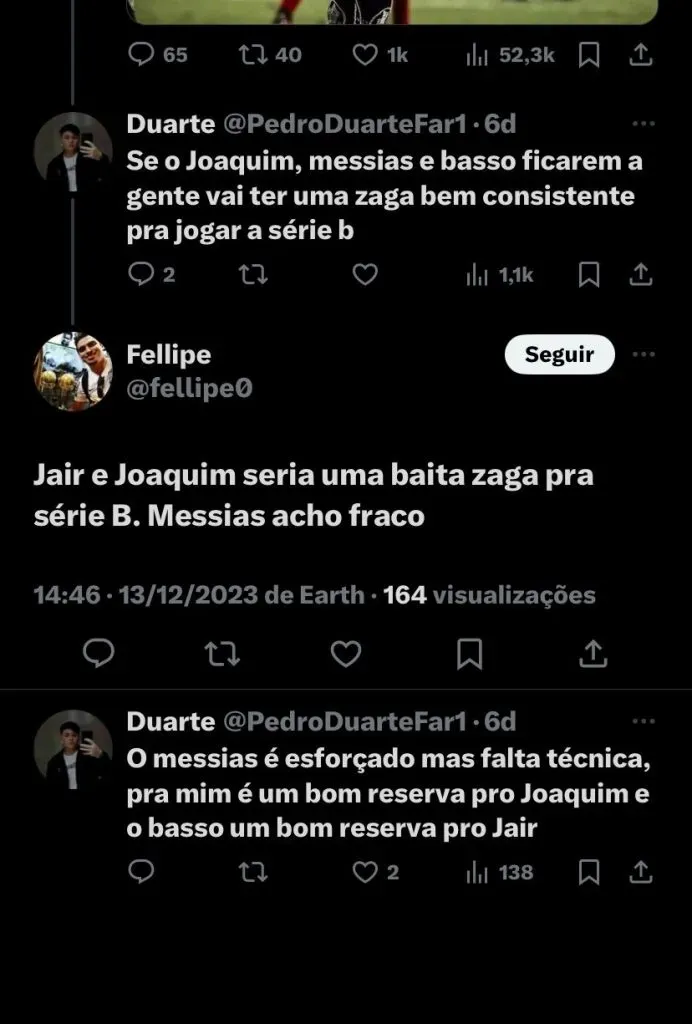 João Basso ou Jair abertos pela direita para a construção de jogo”; “Se o Joaquim, Messias e Basso ficarem a gente vai ter uma zaga bem consistente pra jogar a Série B”, foram alguns comentários.