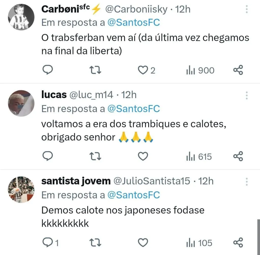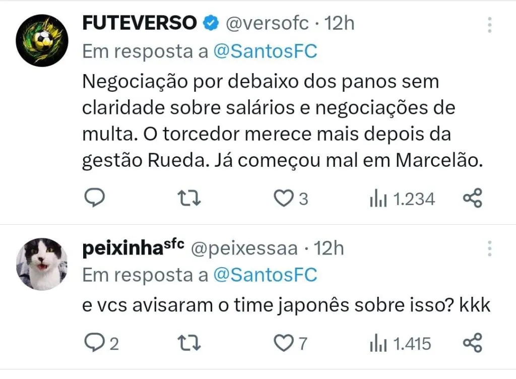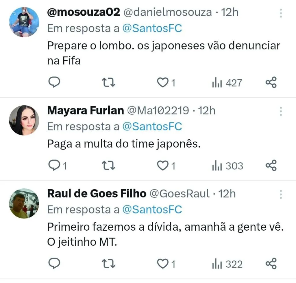 A informação criou um clima de insegurança entre os torcedores santistas que temem punições da FIFA. “Ele ainda tem contrato assinado com o Time Japonês. Vamos com calma, sem amadorismos pois isso pode prejudicar o clube. (ainda mais).”, alertou um torcedor no ‘X’.