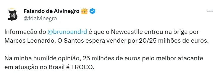 Segundo o UOL Esportes, o Newcastlle, da Inglaterra, é o mais novo interessado no camisa 9 santista. O Peixe estipula vendê-lo por algo entre 20 milhões de euros (R$ 106,5 milhões) e 25 (R$ 133 milhões).