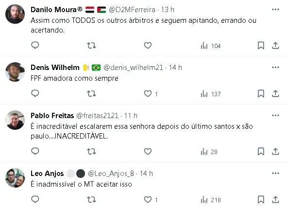 Na nota, o Santos respeitou a decisão da Comissão de Arbitragem da Federação Paulista de Futebol, mas expressou a expectativa de que os erros cometidos pela árbitra no passado tenham servido de aprendizado e reflexão para um aprimoramento em seu nível técnico.