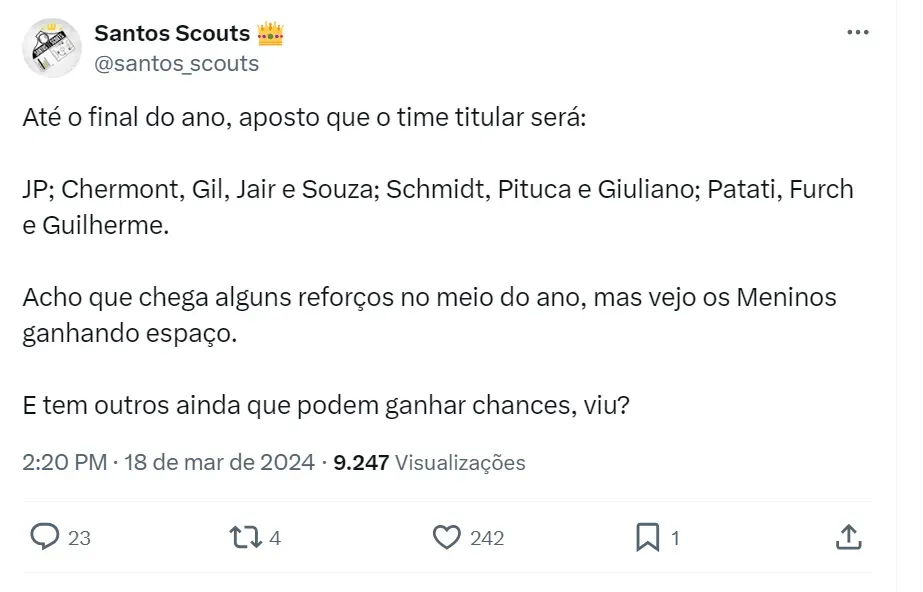 O jogador de 20 anos é revelado nas categorias de base do Peixe e subiu ao elenco profissional no ano passado. Ele já tem quatro partidas na atual edição do Campeonato Paulista e é muito melhor que Pedrinho, por exemplo.