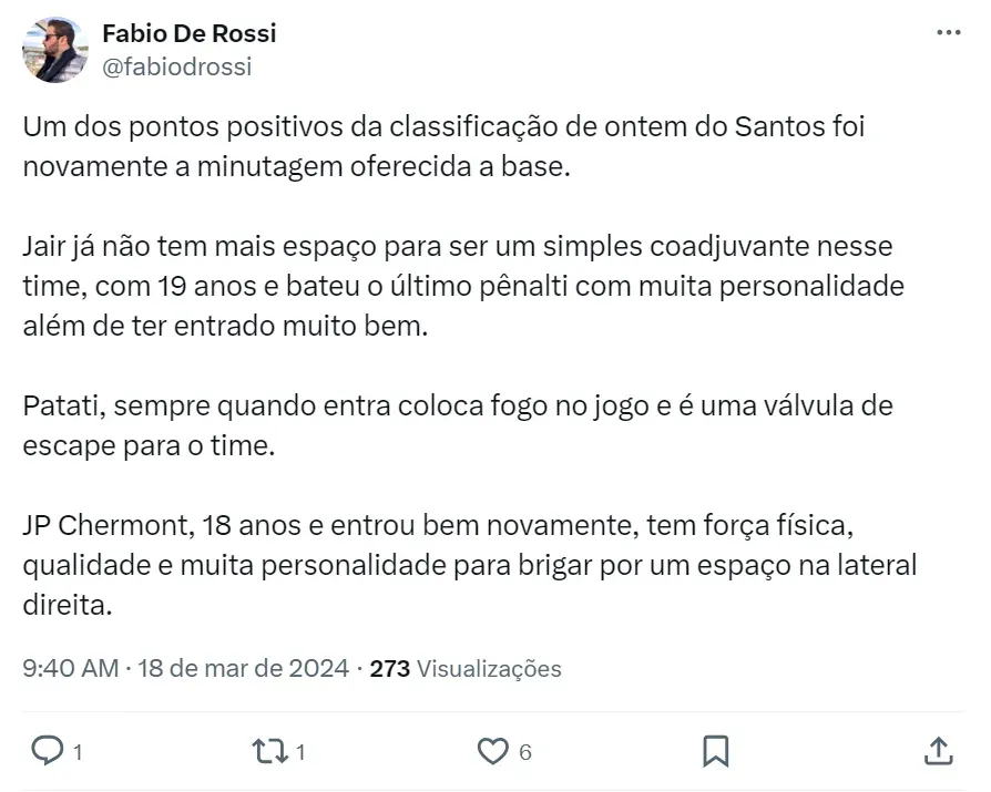 O fato é que o zagueiro entrou muito bem na partida, qualificando a saída de bola da defesa do Santos e Joaquim não fazia um bom jogo. Além disso, o Menino da Vila mostrou personalidade na decisão de pênaltis.