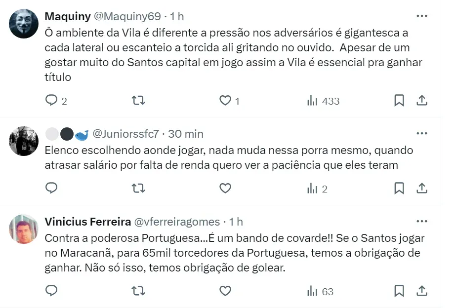No entanto, o treinador Fábio Carille afirmou em coletiva de ontem que o Alvinegro Praiano atuará contra a Lusa na Vila Belmiro, deixando a torcida santista decepcionada. Os torcedores gostariam que o jogo fosse na capital paulista.