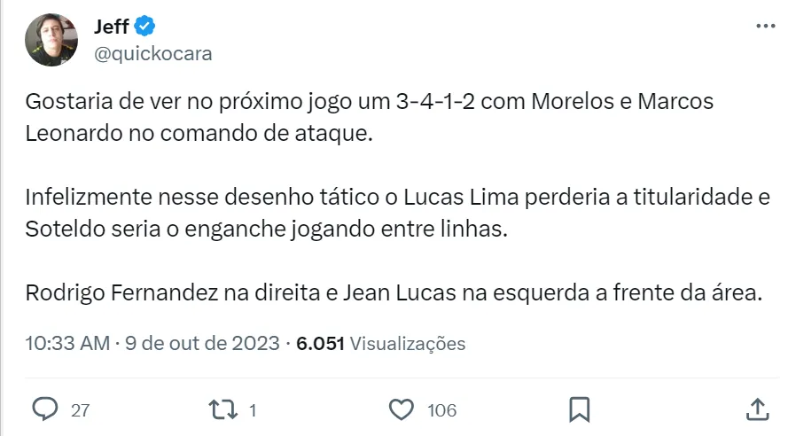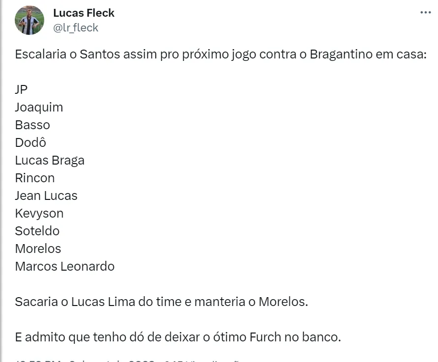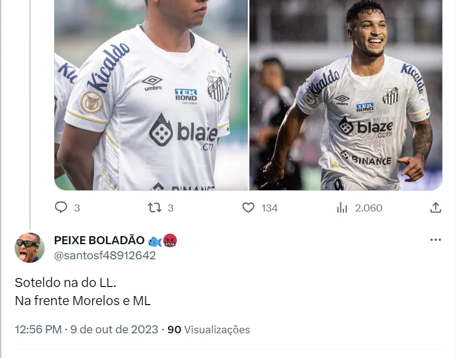 Com isso, os torcedores do Santos nas redes sociais estão sugerindo que Yeferson Soteldo volte ao time titular, mas na função de meia armador. Dessa forma, Lucas Lima ficaria no banco de reservas para Morelos ser mantido no ataque (como pode ser visto nos tweets acima). Os santistas acreditam que o esquema 3-4-1-2 pode funcionar e dar frutos ao time do Peixe diante do Bragantino.