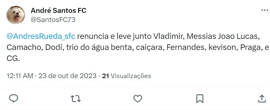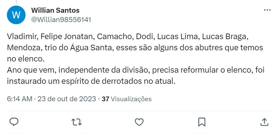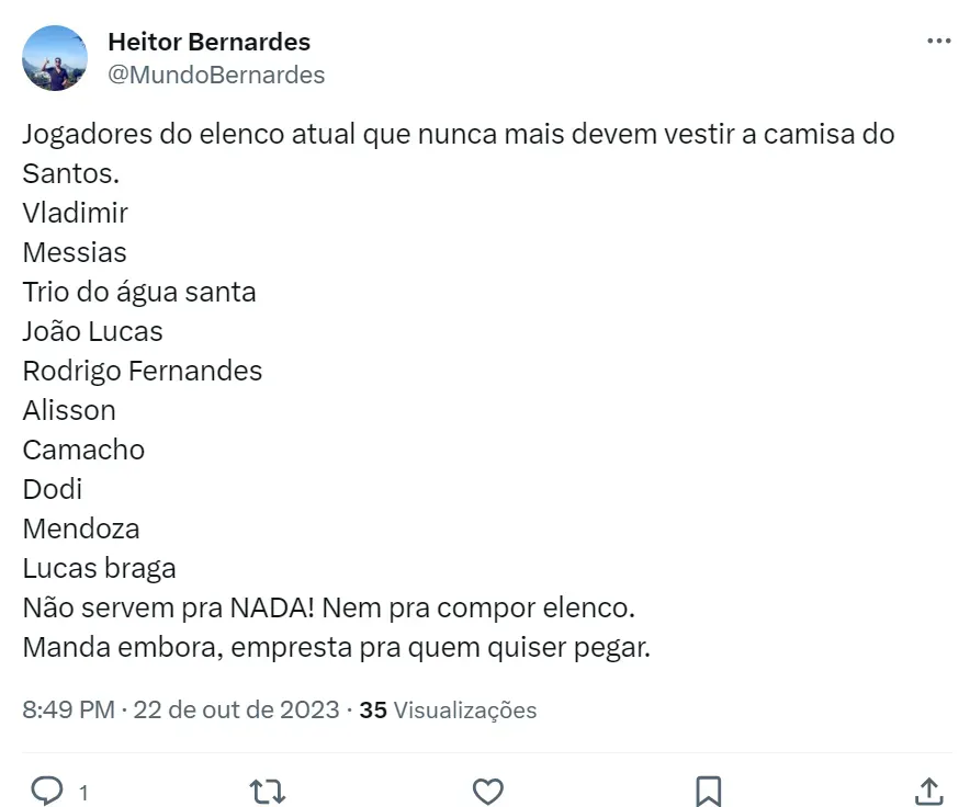 Mas, Vladimir não é o único citado pelos santistas. Messias, João Lucas, Lucas Braga, Camacho, Rodrigo Fernández, Alison, Mendoza, Dodi, Bruno Mezenga, Luan Dias e Gabriel Inocêncio também são mencionados como jogadores que não podem mais vestir a camisa do Alvinegro Praiano. Os torcedores do Peixe acreditam que eles não possuem mais condições de sequer compor o banco de reservas.