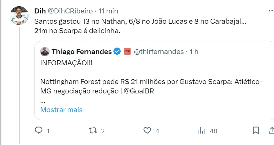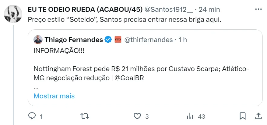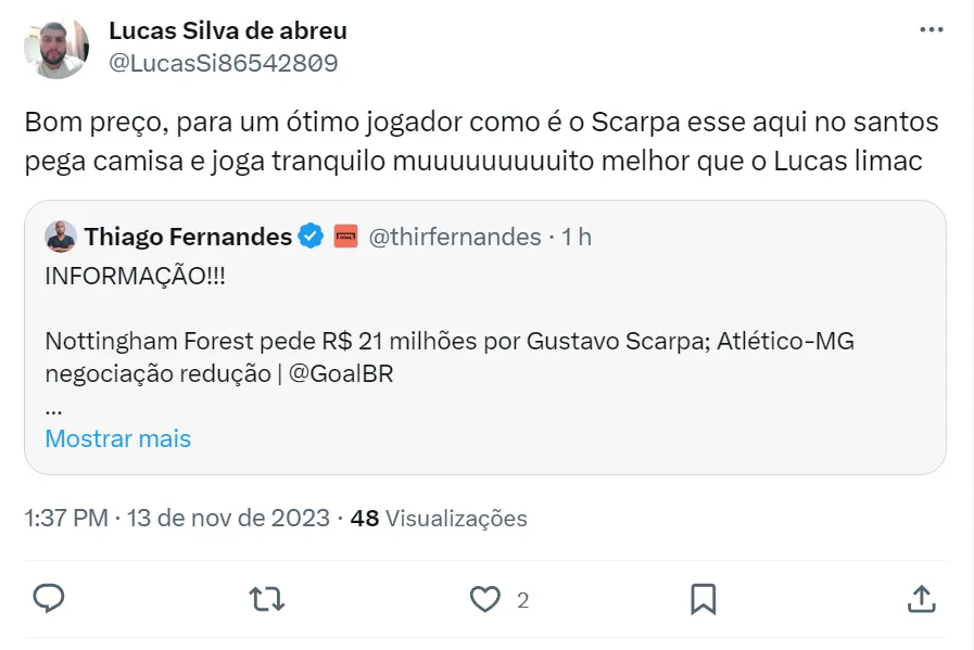 Os torcedores do Santos acreditam que o valor pedido pelos ingleses por Gustavo Scarpa está muito barato e vale a pena investir nessa contratação para a próxima temporada.