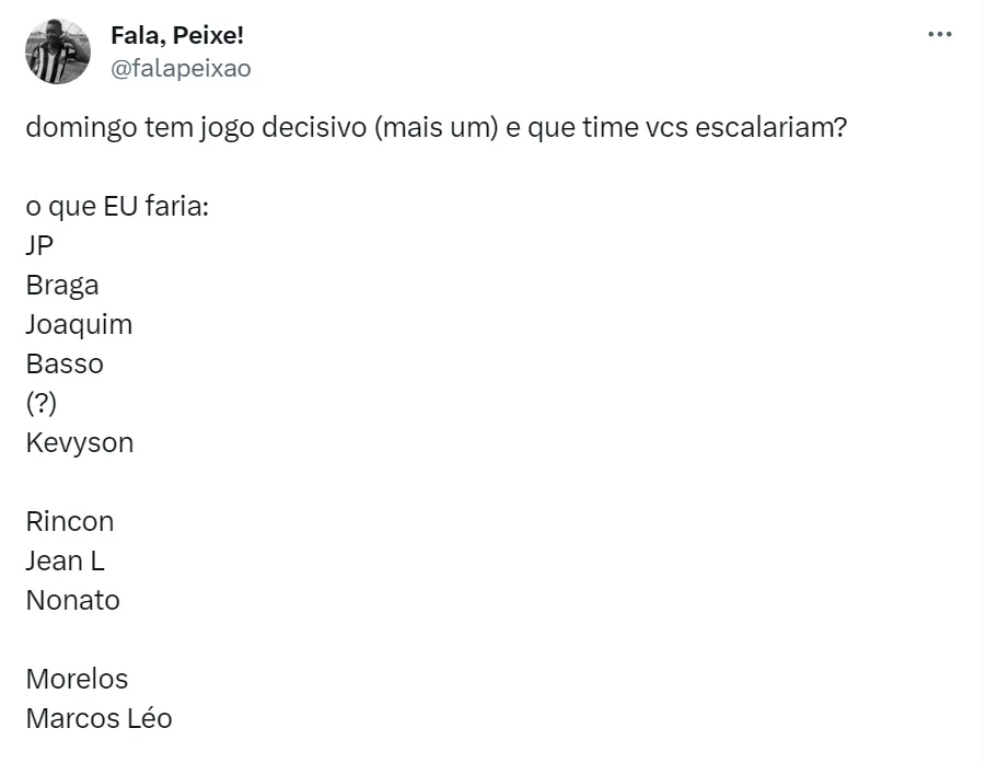 Para a vaga de Lucas Lima, os torcedores do Santos pedem a escalação de Nonato. O camisa 7 santista não é meia armador, mas o Peixe não tem outro meia de origem no elenco para substituir Lucas Lima. No ataque, o pedido é para o colombiano Alfredo Morelos, que chegou ao Clube da Vila Belmiro recentemente, faça sua estreia como titular e atue ao lado de Marcos Leonardo (como pode ser visto nos tweets acima).