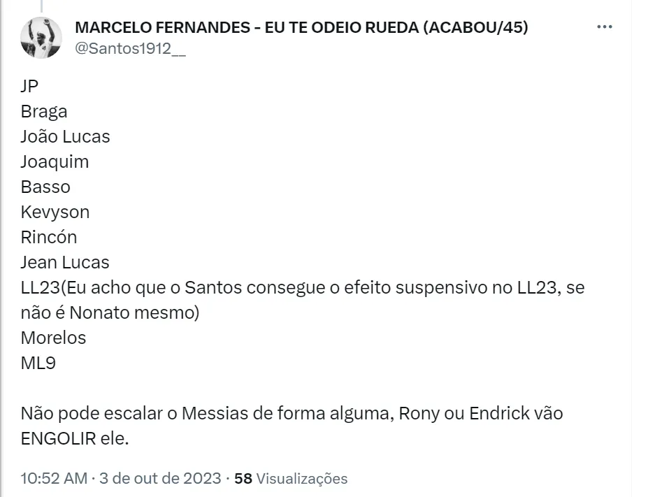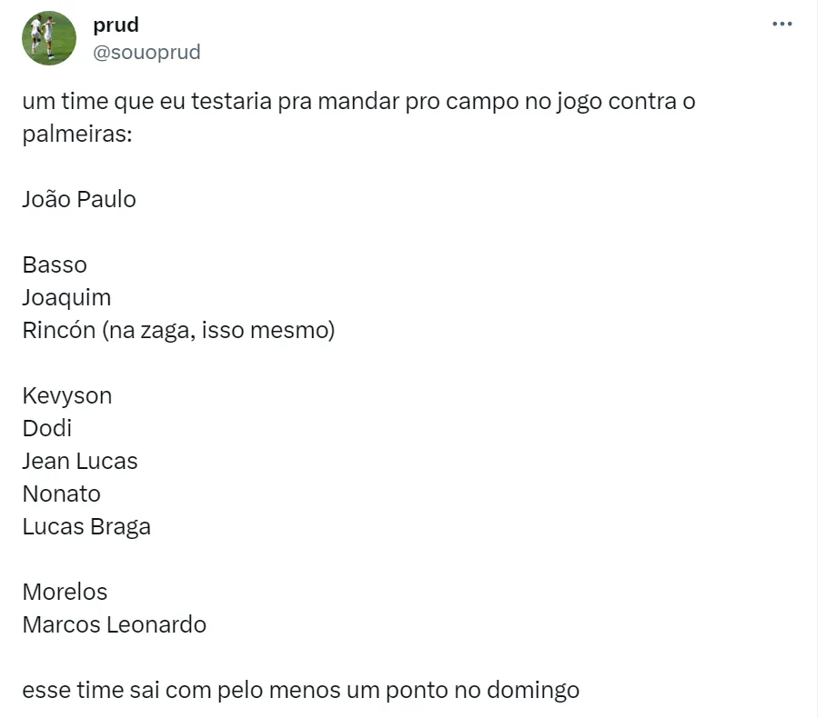 Com isso, os torcedores santistas na rede social estão ‘montando’ o time ideal para o clássico contra o Palmeiras. Na zaga, é a maior dúvida dos torcedores: alguns improvisariam João Lucas ou Tomás Rincón em uma linha de três, enquanto outros apostariam no jovem Jair, promessa das categorias de base do Alvinegro Praiano. Messias, experiente zagueiro do elenco profissional, é a opção que menos agrada a torcida.