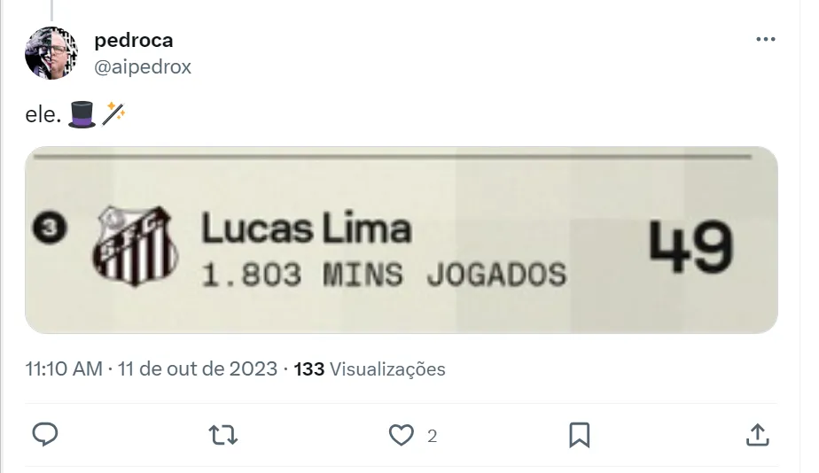 “Não dá pra refutar os números. O Lucas Lima é muito importante pro time”, disse um torcedor do Santos. “O perninha do Lucas Lima sabe jogar bola. Isso é fato”, foi enfático outro santista no Twitter. No Brasileirão Série A, Lucas Lima tem quatro assistências e um gol marcado. Após cumprir suspensão, ele fica à disposição de Marcelo Fernandes contra o Red Bull Bragantino, no dia 19 de outubro, na Vila Belmiro.