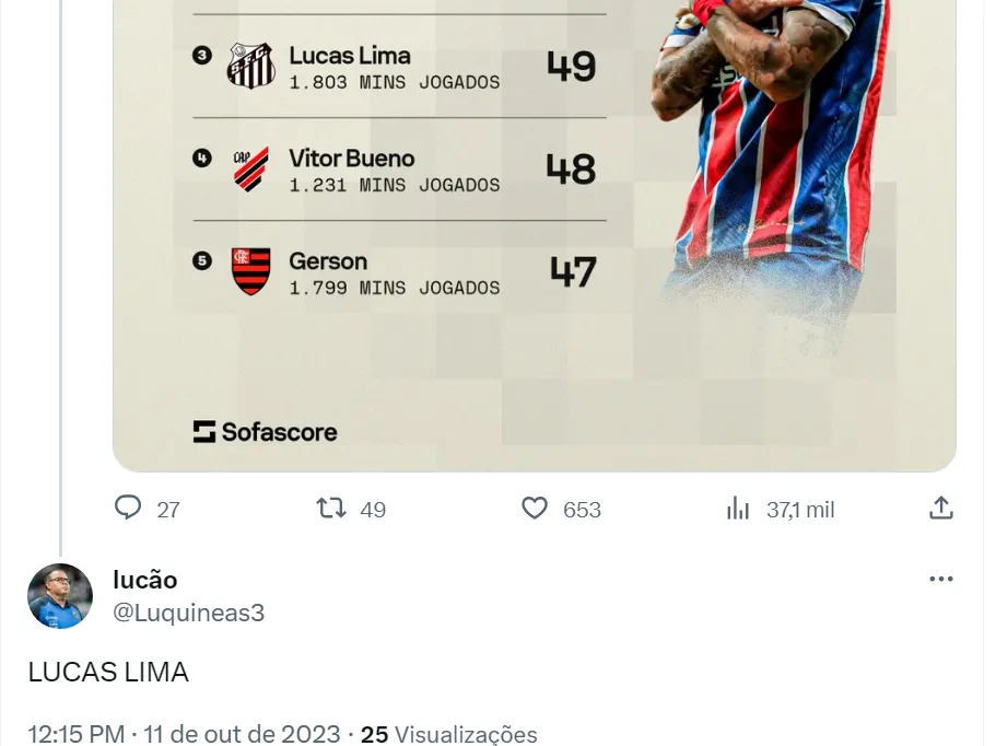 Apesar disso, os torcedores do Santos nas redes sociais valorizam a importância que tem Lucas Lima para o time de Marcelo Fernandes. O perfil Sofascore, especialista em estatísticas sobre futebol, divulgou a lista do Brasileirão com mais passes decisivos e o meia aparece em terceiro no ranking. Ele deu 49 passes decisivos na competição nacional, o que fez os santistas rasgarem elogios para ele.