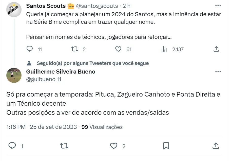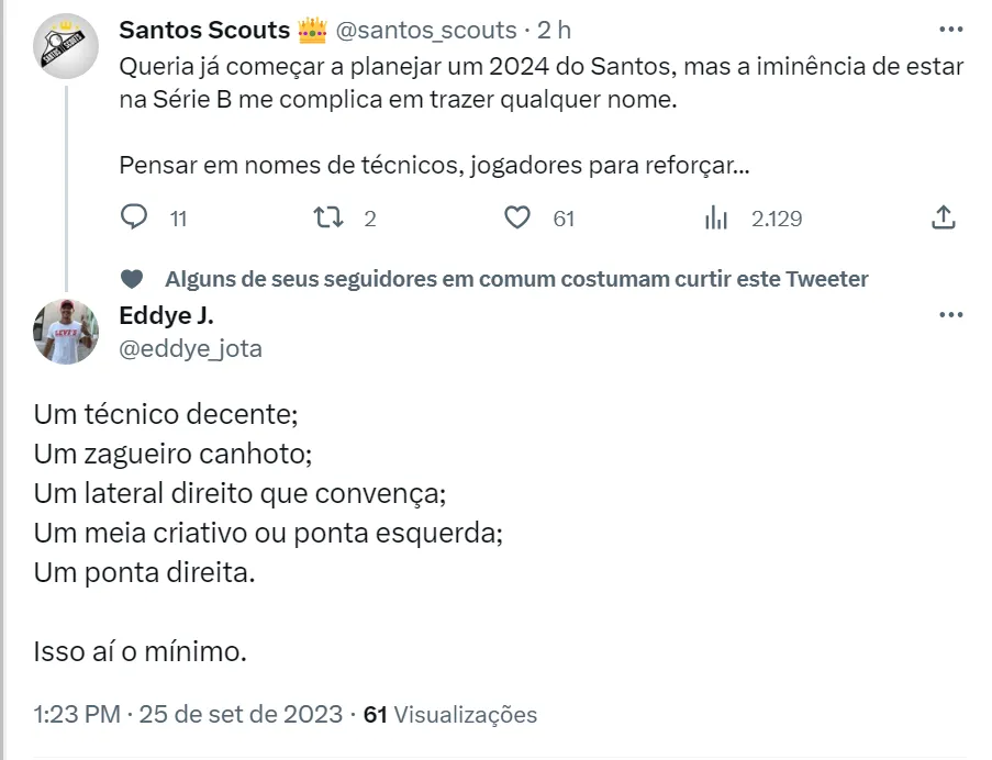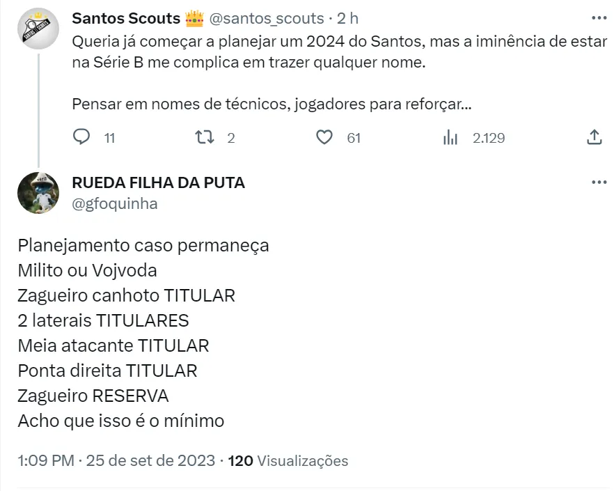 Além disso, os torcedores do Santos acreditam ser preciso contratar muitos jogadores para reforçar o elenco (como pode ser visto nos tweets acima). A avaliação é que o time atual do Peixe não condiz com a história e tradição do clube. Um dos maiores pedidos é pela chegada de um ponta direita para desbancar Mendoza, que chegou ao Alvinegro Praiano nesta temporada e não convenceu os santistas.
