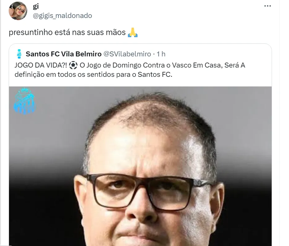 “A torcida santista está com você, presuntinho (Marcelo Fernandes). Ganhe do Vasco, pelo amor de Deus”, disse um torcedor no Twitter. “Santos, eu peço pra vocês, não liguem pro Luxemburgo. Deixa o presuntinho”, afirmou uma torcedora do Peixe na rede social. “Luxemburgo demitido do Corinthians. Por favor, presuntinho, ganhe do Vasco. Não irei suportar o Galo contratando o LUXEMBURGO com aquele futebol medíocre”, afirmou mais um santista.