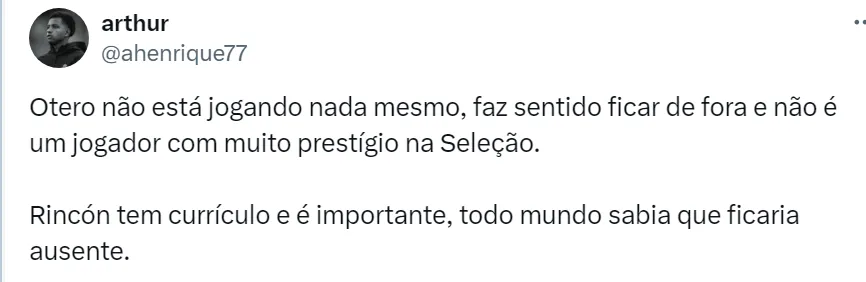 Na primeira lista do treinador Fernando Batista, Otero estava em uma convocação de 47 nomes. Agora, a lista caiu para 30 jogadores e o meia do Peixe foi cortado. O volante Tomas Rincon, reserva no time santista, segue convocado.