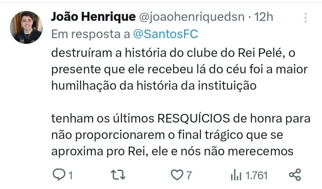 Para o colunista Juca Kfouri, a missão do Santos de escapar do rebaixamento ficou ainda mais complicada. “Eu acho que será surpreendente se o Santos evitar a queda. E aí tem essa ironia toda, no dia anterior do aniversário do Rei, o Santos toma de sete, como o Brasil tomou da Alemanha para a tristeza do Rei, como o Santos já havia tomado do Corinthians em 2005, e não tem perspectiva.”, avaliou o jornalista durante participação no podcast Posse de Bola.