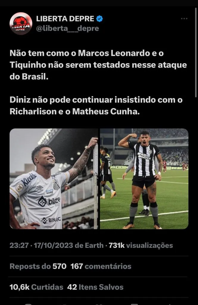 Após marcar quatro gols nas últimas três rodadas, Marcos Leonardo tem diversos focos, o principal é ajudar o time santista a sair dessa má fase atual. Além disso, ele também está de olho em Tiquinho Soares, que tem 15 marcados, o artilheiro do Campeonato Brasileiro, já o Menino da Vila, tem 12 tentos marcados, a intenção do atleta é tantar colar ao máximo e até mesmo ultrapassar o jogador do Botafogo.