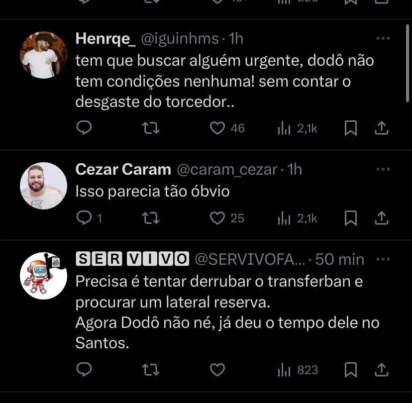 (SIC): “Tem que buscar alguém urgente, Dodô não tem condições nenhuma, sem contar o desgaste do torcedor”; “Precisa tentar derrubar o TrasnferBan e procurar um lateral reserva. Agora, o Dodô já deu”, foram alguns comentários da torcida.