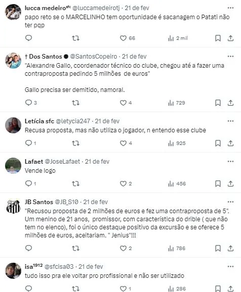 Contudo, nem só de especulações sobre possíveis saídas vive o Peixe. O Clube quer aproveitar a atual janela de transferências, que fecha no dia 7 de março. Gallo afirmou que o Santos deve contratar ao menos mais quatro reforços e as prioridades foram expostas na Vila.