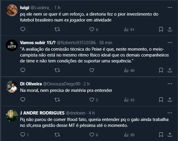 Vale mencionar que o jogador custou cerca de R$ 5,2 milhões aos cofres santistas e, mesmo que o valor só comece a ser pago a partir de 2025, o desempenho vem sendo motivo de críticas. Até por isso, Carille não deve utilizá-lo até ele melhorar o condicionamento.