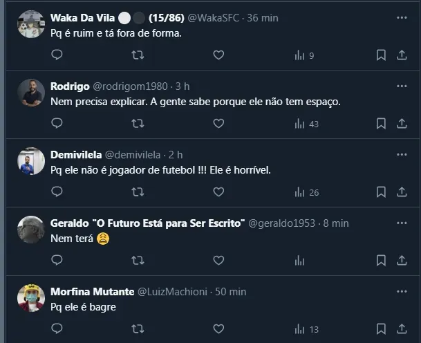 Contratado junto ao Atlético-MG com a esperança de ser titular, o meio-campista sequer saiu do banco de reservas e vem tendo problemas na adaptação. Não à toa, o torcedor santista vem criticando sua condição física.
