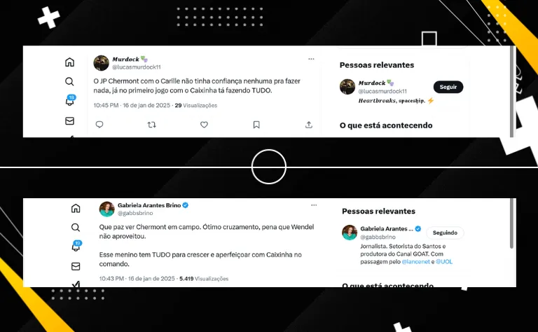 “O JP Chermont com o Carille não tinha confiança nenhuma pra fazer nada, já no primeiro jogo com o Caixinha tá fazendo tudo”, opinou um torcedor do Peixe no X (antigo Twitter).