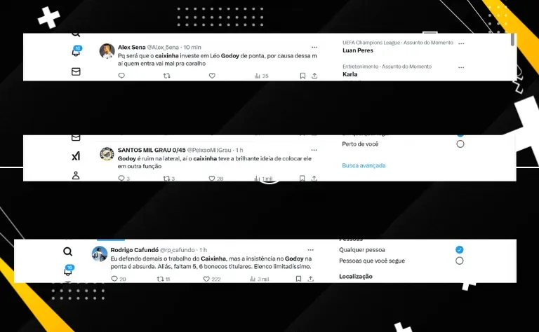 Nas redes sociais, Caixinha foi criticado por ala dos santistas pela insistência em convicções que não têm surtido efeito até aqui no Estadual. Uma delas é a opção pelo lateral-direito Léo Godoy na função de ponta.