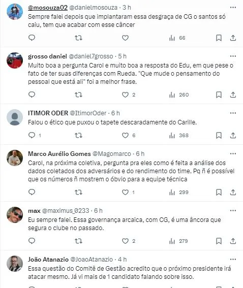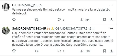 “Ainda bem que tem uma eleição agora em dezembro que possa entrar um presidente que goste realmente do Santos e não esteja ali porque fala que não entende de futebol, mas quer se meter no futebol”, disparou Dracena.