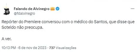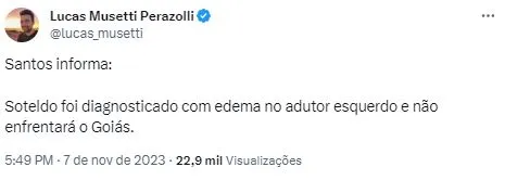 O fato vai impactar justamente o duelo contra um concorrente direto, o Goiás, que recebe o Peixe nesta quinta-feira (9), em Goiânia. Segundo jornalista Lucas Musetti, Soteldo foi diagnosticado com um edema no adutor esquerdo e está fora da partida.