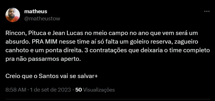 Já que sem grandes pretensões para a temporada, apenas a permanência na Série A, a diretoria do Peixe já está visando a temporada de 2024. E para isso terá um grande reforço, trata-se de Pituca, que assinou um pré-contrato com a equipe e chega de forma definitiva no próximo ano. Mas, mesmo não atuando pela equipe paulista, o jogador já está sendo preparado para o Santos.